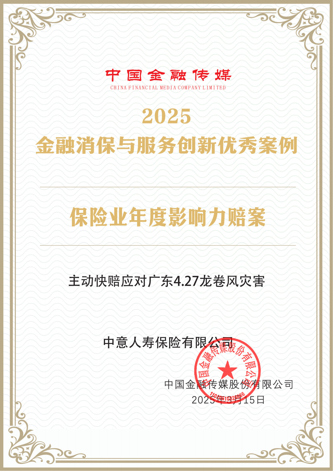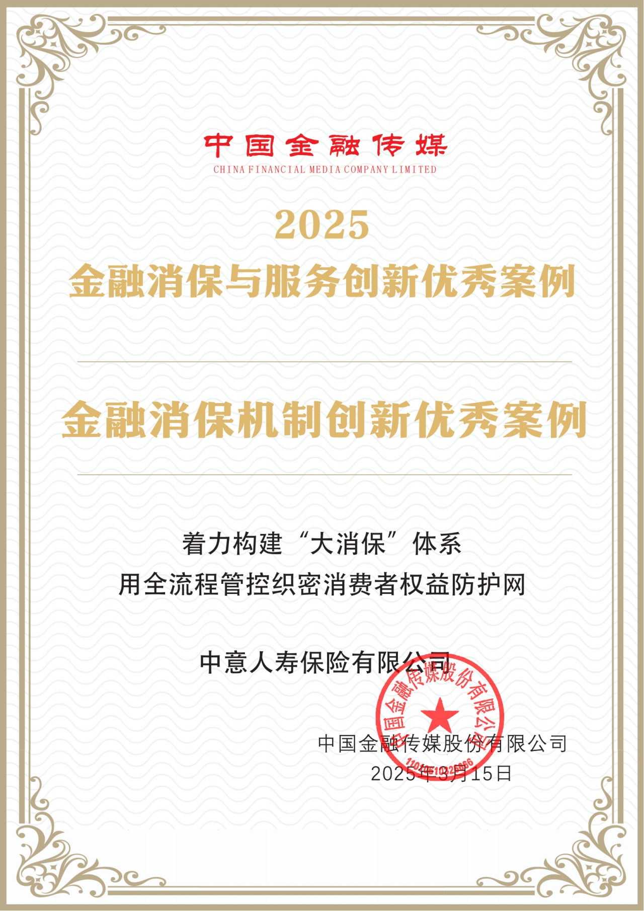 近日,由《中國銀行保險報》主辦的2025年金融消保與服務創新優秀案例評選結果對外公布,中意人壽保險有限公司(以下簡稱“中意人壽”)兩項案例獲獎。其中,《著力構建“大消保”體系,用全流程管控織密消費者權益防護網》榮獲“金融消保機制創新優秀案例”,《主動快賠應對廣東4.27龍卷風災害》榮獲“保險業年度影響力賠案”。本次獲獎,體現出中意人壽始終堅持“金融為民”的價值取向,彰顯出其在消費者權益保護與理賠服務方面的不懈努力及優秀成果。
